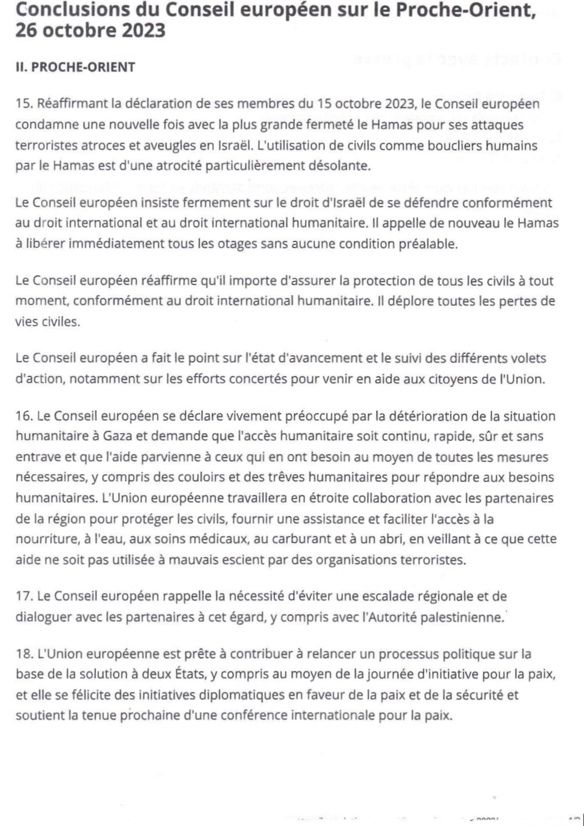 Conclusions du Conseil européen sur le Proche-Orient, 26 octobre 2023
